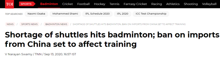 《印度时报》:羽毛球不足殃及(印度)羽毛球运动,禁止来自中国的进口势必影响训练