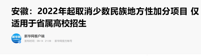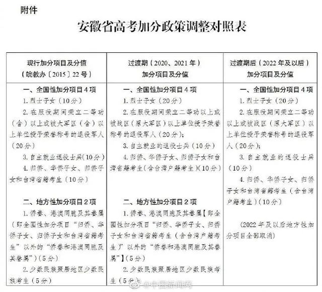 近日,安徽省教育厅发布《安徽省关于进一步调整和规范高考加分工作的实施方案》。方案明确,自2022年起,取消“侨眷、港澳同胞及其眷属”和“少数民族聚居地区少数民族考生”两项地方性加分项目。2020、2021年符合条件的高考考生仍具有加分资格,加分分值为5分,仅适用于安徽省省属高校招生。