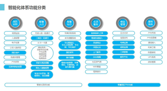 荣盛的智能化体系由智能化系统工程和智慧园区软件平台组成。其中,智能化系统工程包含四大系统:信息设施、信息应用、安全防范、辅助工程,智慧园区软件平台包含智慧园区软件平台、业主APP、物业APP等。智能化体系功能又细分为园区安防、智慧人行、智慧车行、生活服务、物业管理和基础系统。