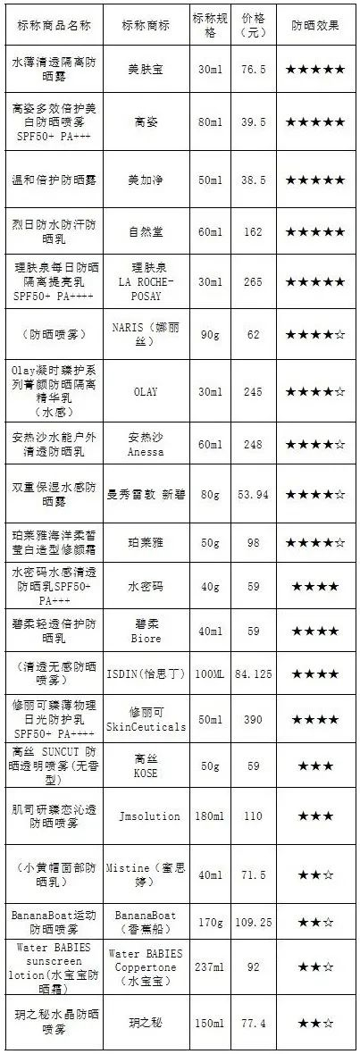 除了传统防晒霜,补擦方便的防晒喷雾、有防晒功能的隔离粉底等防晒化妆品也受到越来越多。本次试验样品价格从38.5-390元不等,若按每次使用量为1ml(g)来计算,每次使用价格从0.39-8.83元不等。