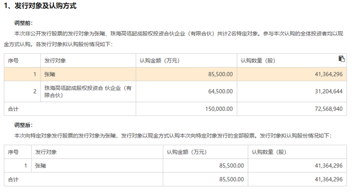 而在修改方案后,高瓴懿成不再参与本次定增,8.55亿元的定增额度由公司实控人张曦全部包揽。