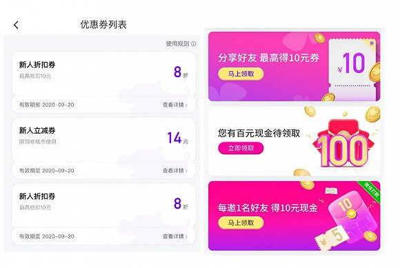 按照滴滴的说法,花小猪定位年轻用户市场,用户可以通过完成多种简单任务如签到、推荐领取奖励以节省出行成本。据了解,花小猪为了吸引用户,补贴力度空前,堪比当年网约车大战时的烧钱补贴。以北京用户为为例,不但有一张14元的立减券和有两张8折的折扣券,还有分享、邀请好友得10元现金的活动。