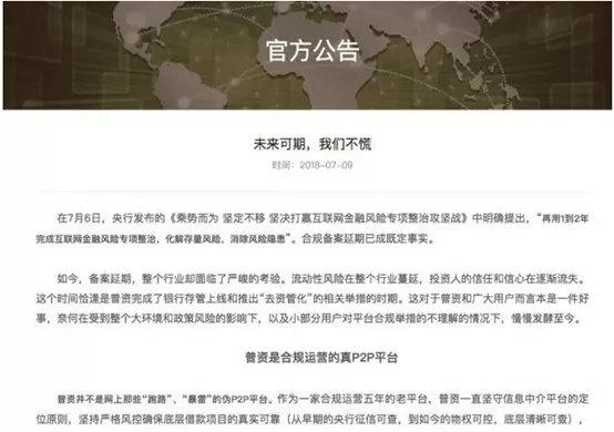 值得一提的是,就在2018年7月9日,普资金服官网还发布了一份名为《未来可期,我们不慌》的公告。在这份公告中,普资金服特意强调自己是“合规运营的真P2P平台”,并提到了目前宏观环境以行业整体环境以及流动性风险、政策风险。