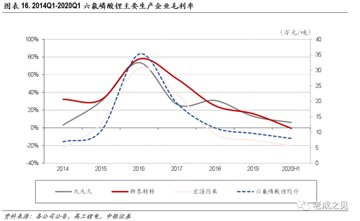 行业内主要企业盈利能力处于周期底部。六氟磷酸锂价格与行业内企业盈利能力呈现明显的正相关关系,虽然行业内企业成本有一定的差异,但是在价格高企时成本并不是决定盈利能力的主要因素,在价格处于低位时成本领先的企业能够更好地抵御风险,快速提升市场份额,盈利能力的周期波动主要还是由价格决定的。我们以行业内企业九九久、新泰材料、宏源药业为例,发现其六氟磷酸锂业务的盈利能力呈现出明显的周期性。2014年六氟磷酸锂均价不到7万元/吨,以上三家企业六氟磷酸锂业务毛利率分别为3.19%、32.18%、-23.08%;2016年六氟磷酸锂均价涨到35万元/吨的高点,三家企业对应毛利率分别为73.68%、77.69%、67.23%,行业内企业盈利能力处于周期高点;此后随着六氟磷酸锂均价的下滑,毛利率也呈现出明显的下降趋势,到2020年上半年,六氟磷酸锂均价接近历史低位,行业内企业毛利率也接近历史最低水平,其中新泰材料、宏源药业毛利率分别为-0.58%、-20.37%,行业处于普遍亏损状态,企业涨价诉求强烈,盈利有望实现修复。