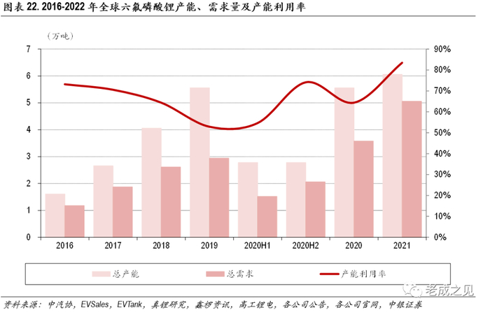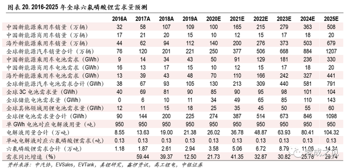 长期来看,我们预计2020-2025年全球新能源汽车销量分别为250、377、506、668、884、1207万辆,对应动力电池需求分别130、213、309、440、581、791GWh,加上消费、储能及其他领域用锂电池,预计2020-2025年锂电池总需求分别为274、387、514、673、846、1098GWh,对应六氟磷酸锂需求量分别3.58、5.06、6.72、8.79、11.06、14.34万吨,年均复合增速为32%,需求长期高增长无忧。