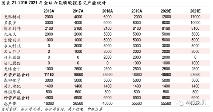 六氟磷酸锂进入低速扩产期。根据我们的统计,自2016-2017年行业投产高峰期之后,行业新增产能投产速度明显放缓。内资产能扩产以龙头为主,2020年之后仅多氟多和天赐材料有扩产计划,预计2020-2021年内资产能分别为4.87、5.37万吨,外资产能自2017年以来一直稳定在6,900吨,2020-2021年六氟磷酸锂总产能分别为5.56、6.06万吨,2021年后基本没有新建产能的投产,供给侧行业产能保持相对稳定。