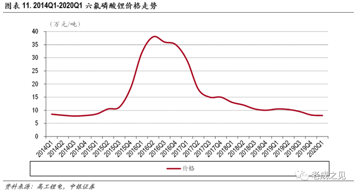 2011年六氟磷酸锂实现国产化,打破了国外垄断,价格开始下跌,此后国内六氟磷酸锂厂商开始第一轮扩产,但是需求尚未大规模启动,供过于求导致价格长期低于10万元/吨;2015年国内新能源汽车销量同比增长3.4倍,带动六氟磷酸锂需求大增,叠加行业扩产周期长达1年以上,导致供需关系逆转,价格由2015年第三季度的10万元/吨上涨至2016年二季度的38万元/吨,涨幅高达280%;高价刺激行业内厂商纷纷扩产,并吸引外部企业进入行业,与此同时,行业需求增速下滑,供给远大于需求,导致价格再次下行。到2017年第四季度,六氟磷酸锂价格跌至15万元/吨;进入2018年,价格下滑速度放缓,进入9.5-11万元/吨的区间;由于2019年新能源汽车销量和2018年持平,六氟磷酸锂的需求没有增长,而此前新投产产能过多,行业仍然供大于求, 叠加主要原材料碳酸锂价格持续下跌,六氟磷酸锂价格仍处于阴跌的通道中,到2020年第一季度,六氟磷酸锂行业均价8万元/吨,接近历史最低水平,行业内企业大多数处于亏损状态。