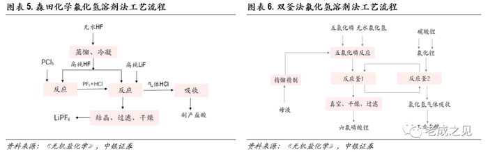 采用氟化氢溶剂法制备六氟磷酸锂的代表企业有多氟多、九九久(延安必康子公司)、宏源药业、新泰材料(天际股份子公司)等,按照工艺流程的不同,分为以森田化工为代表的工艺流程和多氟多自主研发的双釜法两种。