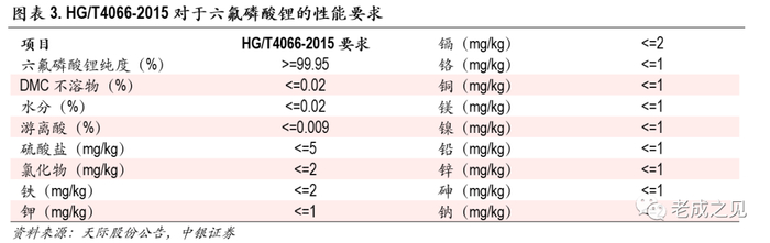 商品化六氟磷酸锂的标准要求较高。2015年7月29日,工信部发布化工行业标准六氟磷酸锂HG/T4066-2015代替HG/T4066-2008,从2016年1月1日起正式实施。该标准对于六氟磷酸锂的纯度、不溶物、水分、游离酸以及金属杂质的含量都提出了明确要求,其中纯度要求达到了99.95%以上,金属杂质含量要求均达到了PPM级别,这一标准对行业进行了规范,同时也提高了行业准入门槛。