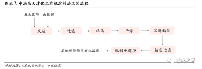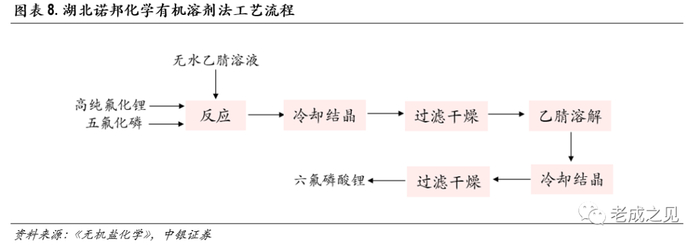有机溶剂法具备替代潜力。有机溶剂法是采用制造电解液的有机溶剂如EC、DEC和DMC等作为溶剂,或者采用没有腐蚀性的有机络合剂如乙腈、醚和吡啶等来代替氟化氢,将氟化锂悬浮于有机溶剂中通入五氟化磷,反应后制得六氟磷酸锂;前者以中海油天津化工研究设计院为代表,后者以湖北诺邦化学为代表。