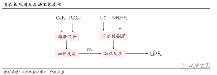 气固反应法未实现大规模应用。气固反应法将氟化锂用无水氟化氢处理形成多孔氟化锂,然后通入五氟化磷气体与多孔氟化锂反应生成六氟磷酸锂,目前主要采用氟化钙和五氧化二磷为原料干法反应制备五氟化磷气体,再将高纯氟化锂与五氟化磷气体在加压条件下干法合成六氟磷酸锂。