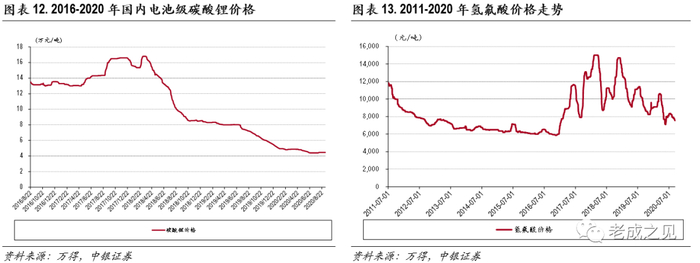 六氟磷酸锂行业处于产业周期底部。六氟磷酸锂行业周期性较强,当前国内价格7.5万元/吨,处于周期底部,继续下跌的空间较小,主要原材料碳酸锂和无水氟化氢的价格也处于周期底部位置,为六氟磷酸锂价格提供了支撑。根据我们的估算,氟化氢溶剂法制备六氟磷酸锂的成本约为6.59万元/吨,在当前价格条件下,对应毛利率0.73%,行业处于普遍亏损状态;有机溶剂法制备液体六氟磷酸锂的成本约为1.94万元/吨,折合固体六氟磷酸锂成本约5.83万元/吨,在当前价格条件下,对应毛利率12.16%,具备一定的优势,但仍处于较低水平。行业内主要企业毛利率和价格具备明显相关性,2020H1主要企业毛利率处于历史低位水平,行业普遍亏损,主要企业涨价诉求强烈。