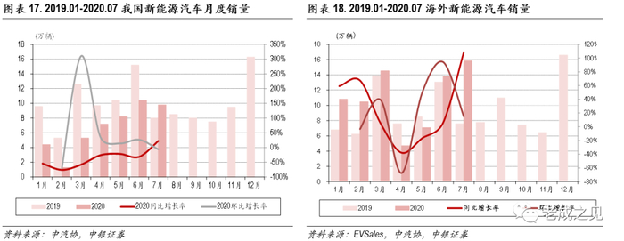 新能源汽车销量有望逐季环比增长。新冠疫情对于新能源汽车上半年销量造成较大冲击,国内市场1-6月合计销量36.8万辆,同比下降41.40%。分月度来看,自2月销量低点之后,国内销量呈现出同比降幅逐月收窄、环比逐季增长的趋势。据中汽协数据,7月新能源汽车销量9.8万辆,同比增长22.50%,实现年内首次同比正增长,环比略有下滑;从海外市场来看,上半年海外新能源乘用车销量61.47万辆,同比增长9.55%,7月海外新能源乘用车销量15.86万辆,同比翻倍,环比增长15%。预计随着国内补贴退坡节奏的放缓和欧洲新能源乘用车支持政策的落地,以及国内和海外车企有竞争力新车型的不断推出,新能源汽车需求有望复苏,销量有望逐季好转,带动产业链需求高增长。