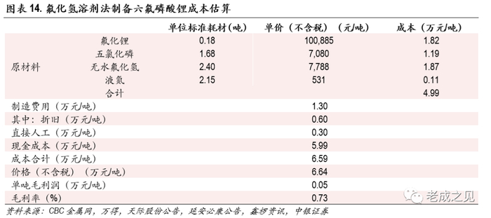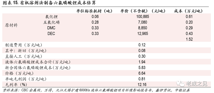 有机溶剂法制备六氟磷酸锂成本估算。有机溶剂法是行业内商业化应用较广的制备方法之一,该方法由于固定资产投资低、工艺步骤少,成本有一定的优势。根据我们的估算,当前时点有机溶剂法制备液体六氟磷酸锂的成本为1.94万元/吨,折合固体六氟磷酸锂成本为5.83万元/吨,在当前含税价格7.5万元/吨的条件下,单吨毛利润为0.81万元,对应毛利率为12.16%,相比氟化氢溶剂法具备一定的优势,但是盈利能力仍处于较低水平。