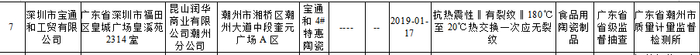 其中,由深圳市宝通和工贸有限公司生产、昆山润华商业有限公司潮州分公司销售的2批次宝通和2#与4#特惠陶瓷碗抗热震性不符合食品相关产品安全国家标准规定。该产品生产日期分别为2019年1月17日和18日,不合格项目均为抗热震性,检验结果均为有裂纹,标准值为180℃至20℃热交换一次应无裂纹,检验机构均为广东省潮州市质量计量监督检测所。