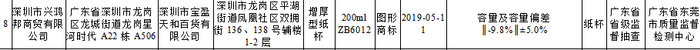 其中,由深圳市兴鸿邦商贸有限公司生产、深圳市宝盈天和百货有限公司销售的增厚型纸杯容量及容量偏差不符合食品相关产品安全国家标准规定。该产品规格型号为200ml ZB6012,生产日期为2019年5月11日,不合格项目为容量及容量偏差,检验结果为-9.8%,标准值为±5.0%,检验机构为广东省东莞市质量监督检测中心。