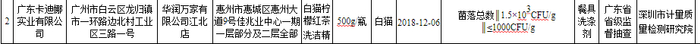 其中,由广东卡迪娜实业有限公司生产、华润万家有限公司江北店销售的白猫柠檬红茶洗洁精菌落总数不符合食品相关产品安全国家标准规定。该产品规格型号为500g/瓶,商标为白猫,生产日期为2018年12月6日,不合格项目为菌落总数,检验结果为1.5×103CFU/g,标准值为≤1000CFU/g,检验机构为深圳市计量质量检测研究院。