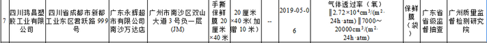 由四川鸿昌塑胶工业有限公司生产、广东永辉超市有限公司南沙万达店销售的手撕保鲜膜20厘米×40米气体透过率(氧)不符合食品相关产品安全国家标准规定。该产品规格型号为20厘米×40米(加赠10米),生产日期为2019年5月6日,不合格项目为气体透过率(氧),检验结果为2.72×104cm3/(m2·24h·atm),标准值为7000~20000cm3/(m2·24h·atm),检验机构为广州质量监督检测研究院。