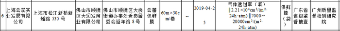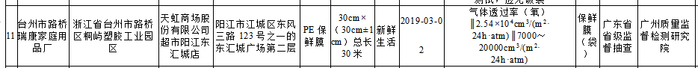 由台州市路桥瑞康家庭用品厂生产、天虹商场股份有限公司超市阳江东汇城店销售的PE保鲜膜气体透过率(氧)不符合食品相关产品安全国家标准规定。该产品规格型号为30cm×(30cm±1cm)总长30米,生产日期为2019年3月2日,不合格项目为气体透过率(氧),检验结果为2.54×104cm3/(m2·24h·atm),标准值为7000~20000cm3/(m2·24h·atm),检验机构为广州质量监督检测研究院。