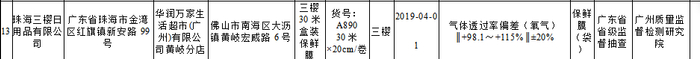 由珠海三樱日用品有限公司生产、华润万家生活超市(广州)有限公司黄岐分店销售的三樱30米盒装保鲜膜气体透过率偏差(氧气)不符合食品相关产品安全国家标准规定。该产品规格型号货号为A890 30米×20cm/卷,生产日期为2019年4月1日,不合格项目为气体透过率偏差(氧气),检验结果为+98.1~+115%,标准值为±20%,检验机构为广州质量监督检测研究院。