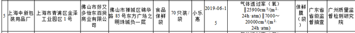 由上海中新包装用品厂生产、佛山市好又多怡东百货商业有限公司销售的食品保鲜袋气体透过率(氧)不符合食品相关产品安全国家标准规定。该产品规格型号为70只装/袋,生产日期为2019年6月15日,不合格项目为气体透过率(氧),检验结果为25900cm3/(m2·24h·atm),标准值为7000~20000cm3/(m2·24h·atm),检验机构为广州质量监督检测研究院。