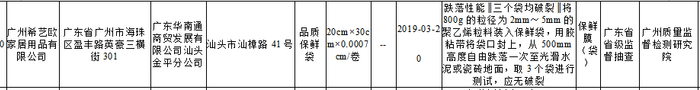 由广州希艺欧家居用品有限公司生产、广东华南通商贸发展有限公司汕头金平分公司销售的品质保鲜袋跌落性能不符合食品相关产品安全国家标准规定。该产品规格型号为20cm×30cm×0.0007cm/卷,生产日期为2019年3月20日,不合格项目为跌落性能,检验结果为三个袋均破裂,标准值为将800g的粒径为2mm~5mm的聚乙烯粒料装入保鲜袋,用胶粘带将袋口封上,从500mm高度自由跌落一次至光滑水泥或瓷砖地面,取3个袋进行测试,应无破裂,检验机构为广州质量监督检测研究院。