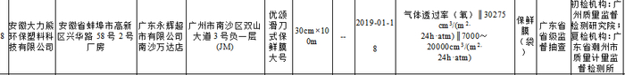 由安徽大力熊环保塑料科技有限公司生产、广东永辉超市有限公司南沙万达店销售的优颂滑刀式保鲜膜大号气体透过率(氧)不符合食品相关产品安全国家标准规定。该产品规格型号为30cm×100m,生产日期为2019年1月18日,不合格项目为气体透过率(氧),检验结果为30275 cm3/(m2·24h·atm),标准值为7000~20000cm3/(m2·24h·atm),检验机构为广州质量监督检测研究院。