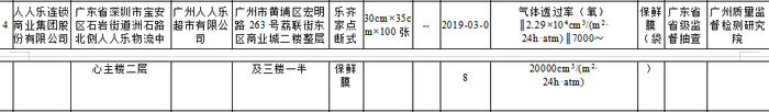 此外,由人人乐连锁商业集团股份有限公司生产、广州人人乐超市有限公司销售的乐齐家点断式保鲜膜气体透过率(氧)不符合食品相关产品安全国家标准规定。该产品规格型号为30cm×35cm×100张,生产日期为2019年3月8日,不合格项目为气体透过率(氧),检验结果为2.29×104cm3/(m2·24h·atm),标准值为7000~20000cm3/(m2·24h·atm),检验机构为广州质量监督检测研究院。