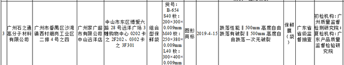 其中,由广州石之通高分子材料有限公司生产、广州家广超市有限公司中山远洋店销售的组合型保鲜袋跌落性能不符合食品相关产品安全国家标准规定。该产品规格型号货号为B-654 S40枚、200×300×0.009mm M40枚、250×380×0.009mm L40枚、300×400×0.009mm,生产日期为2019年4月15日,不合格项目为跌落性能,检验结果为500mm高度自由跌落有破裂,标准值为500mm高度自由跌落一次无破裂,初检机构为广州质量监督检测研究院,复检机构为广东产品质量监督检验研究院。