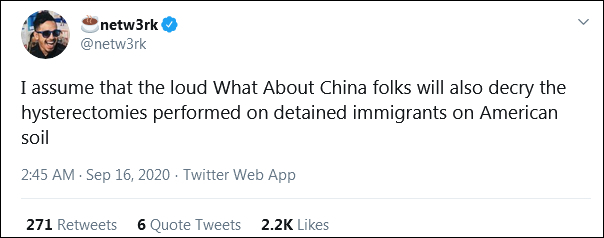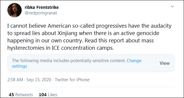 有人嘲讽道:“我想对中国大嗓门的人,也会谴责对美国被拘留移民做子宫切除手术吧。”“我不敢相信,在自诩进步文明的美国,当这样的种族灭绝发生在我们国家的时候,却还在到处散布关于中国新疆的谣言。”