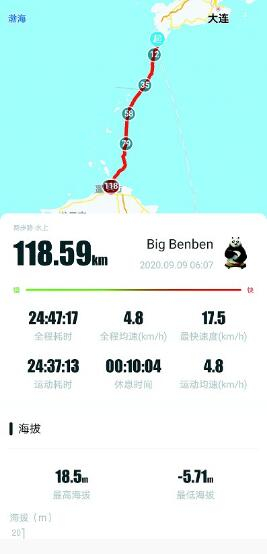 之所以选择这一天,其实随机性比较大。贾宇骄告诉记者,决定挑战横渡渤海海峡后,日期的选择一直是个困扰,因为立秋后,受台风影响,天气变化无常,风向流向也不定。然而9月是具备横渡的最佳月份,担心错过后天气转冷再不能出发,于是在9月9日这天他硬着头皮出发了。