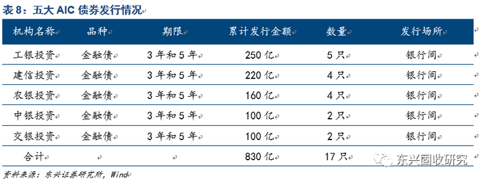(5)金融债:可在银行间或交易所发行,目前五大AIC只在银行间发行过金融债,发行量比较大;资金用途限定为流动性管理和债转股,债转股项目可以包括母行的项目;