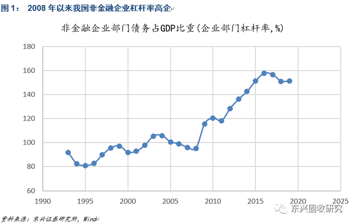 本轮市场化债转股始于2016年,开启背景是在08年金融危机后,国家启动4万亿强刺激政策,随后几年我国大量企业的杠杆率不断提高,债务负担沉重,因此面临经营危机。2016年10月10日,国务院发布了《国务院关于积极稳妥降低企业杠杆率的意见》和《关于市场化银行债权转股权的指导意见》,鼓励有优质资产、发展前景良好但遇到暂时困难的企业开展市场化债转股,债转股第二次被提上日程。从2015年开始,我国非金融企业部门债务占GDP比重就持续在150%以上,2016年达到峰值,截至 2019 年末,我国企业部门杠杆率达151.30%,比峰值157.6%有明显好转,但依然处在历史较高水平。