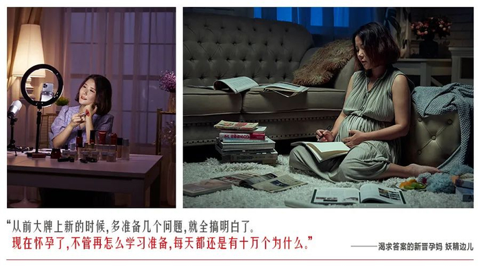 “妖精边儿”是一位美妆博主,2014年开始全职做博主,她很认真,试用产品一个月后才会向粉丝推荐。目前她在微博的粉丝有170万+。今年她有了一个新的身份——妈妈。目前在孕7个半月的她每天都有大大小小的孕期的问题。她会上知乎看一些帖子,还上“妈妈网孕育”这样的APP,每天睡前她会翻阅孕育类的书籍,一般花一个小时。