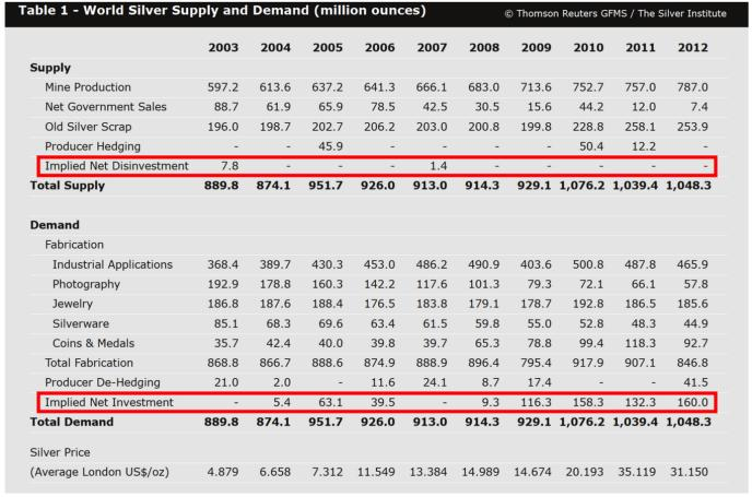 在过去的几十年里,世界白银协会多次改变了他们的数据研究方法。在2013年之前,其年度调查没有披露白银供应净余额。在那些年里,世界白银协会在报告中用“隐含净投资”和“隐含净负投资”来形容白银供需状况。