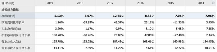 从2014-2019年,公司分别实现营收184.5亿、161.0亿、168.4亿、187.4亿、193.0亿和165.8亿,净利润也随之出现较多起伏。2017年,公司的净利润为12.65亿,而2018年净利润直接腰斩,仅有5.07亿。