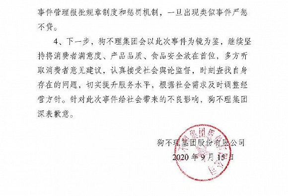 4、下一步,狗不理集团会以此次事件为镜为鉴,继续坚持将消费者满意度、产品品质、食品安全放在首位,多方听取消费者意见建议,认真接受社会舆论监督。