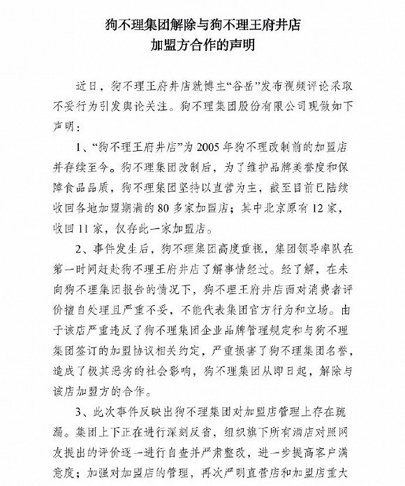 2、“狗不理王府井店”面对消费者评价擅自处理且严重不妥,不能代表“狗不理集团”官方行为和立场。狗不理集团从即日起,解除与该店加盟方的合作。