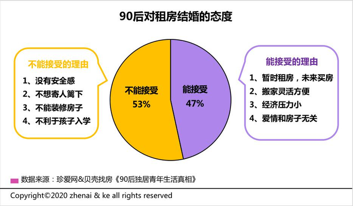 谈及结婚,调查显示,在90后独居青年中,“接受租房结婚”和“不接受租房结婚”几乎各占一半,过半数90后拒绝“租房结婚”,其中缺乏安全感是首要原因。