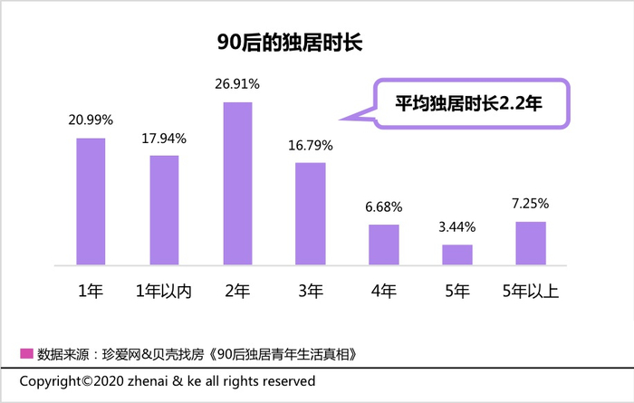 此次跨平台调查收到了1200份有效问卷。结果显示,90后中近八成曾有过独居生活经历(包括独自居住、与陌生人合租零沟通式隐形独居)。从独居时长看,90后青年平均独居时长为2.2年,其中独自一人生活3年及以上的比例达到34.16%。