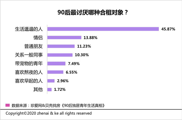 合租对象选择方面,90后青年群体倾向与熟悉的朋友或同事共同租房,最不能接受与生活习惯邋遢的人一起合租,占比达45.87%,其次是不愿意和情侣合租。
