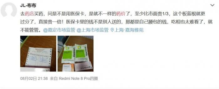 8月2日,上海一名网友也在微博吐槽,“去药店买药,问是不是用医保卡,是就不一样的药价了,至少比市面上贵三分之一,板蓝根就更过分了,直接贵一倍!”