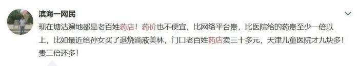 8月16日,一名微博用户也反映,“最近给孙女买退烧滴液美林,门口老百姓药店卖三十多元,天津儿童医院才九块多!贵三倍还多!”