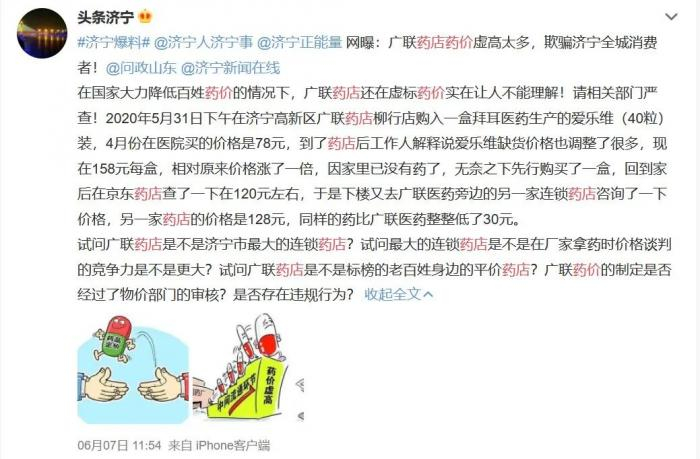 6月7日,济宁一名网友在微博爆料,他5月份在济宁高新区某药店购买的拜耳爱乐维(40粒),售价158元每盒,比4月份在医院买的(78元)贵了一倍多,因为家里已断药,无奈之下先购买了一盒。随后在另一家连锁药店咨询同款药品的报价是128元,整整低了30元,而该药在京东药店约为120元。