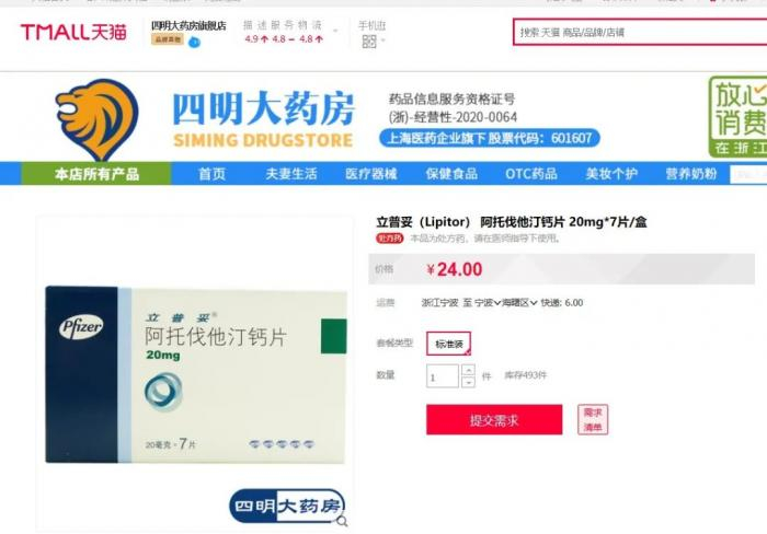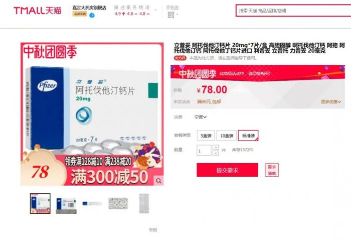 随后,21新健康在天猫上查询发现,与药店同款规格的辉瑞阿托伐他汀钙片最低售价为24元一盒,加上运费后为30元一盒,最高售价为78元一盒(免运费)。对于24元的低价,该药店客服回复21新健康称,系其渠道等不同因素所致。