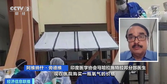 印度医学协会马哈拉施特拉邦分部医生 阿维纳什·旁德维:现在医院购买一瓶氧气的价格已经上涨到500、600卢比,有的甚至高达1500卢比(约合人民币150元),这一价格比原来涨了10倍甚至20倍。