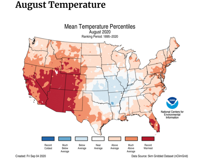 具体而言,在干旱方面,美国西部地区的干旱状况在2020年上半年有所扩大。8月,干旱状况和高温持续不断,整个西部的干旱情况加剧。