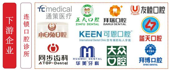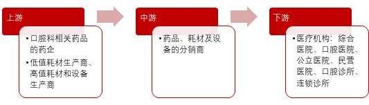 口腔产业的上游主要由口腔科相关药品的药企和耗材与设备的生产商构成。中游主要由药品、耗材及设备的分销商构成、下游由医疗机构如综合医院和口腔医院等构成。