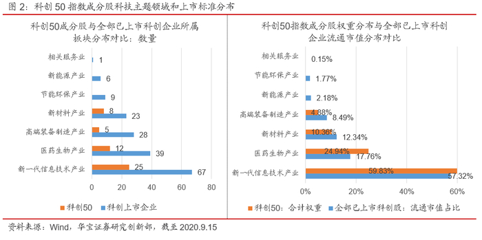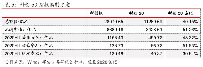 截至2020年9月15日科创50指数成分股的总市值、流通市值分别为11269.69亿元、3428.61亿元,对科创板的市值覆盖率、流通市值覆盖率分别为40.15%、51.26%。根据最新半年报数据,2020年上半年科创50指数成分股合计实现营业收入499.72亿元、归母净利润66.72亿元、研发支出40.37亿元,占科创板整体的比重分别为43.32%、51.83%和30.94%。综合市值覆盖率和盈收、研发指标的占比来看,科创50指数对科创板有较高的代表性。