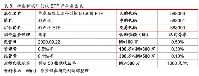 华泰柏瑞科创板ETF:1)2020.09.22正式发行,认购代码588093,现金认购限额50亿;2)华泰柏瑞科创板ETF对于100万份以下的认购费率相对较低。3)作为上交所单市场股票ETF,在上市后华泰柏瑞科创板ETF可实现一二级市场之间的T+0;4)华泰柏瑞权益ETF管理规模排名第5,2006年以来零失误运作旗下ETF产品;5)拟任基金经理柳军投资管理ETF已超过10年,期间经历了2轮完整的牛熊行情,积累了丰富的ETF管理经验,其管理的华泰柏瑞沪深300ETF的任职期总回报为99.36%,年化回报5.80%,自2013年以来该产品连续获得上海证券报和中国证券报的指数基金奖项,是公募市场跟踪沪深300指数的明星产品。